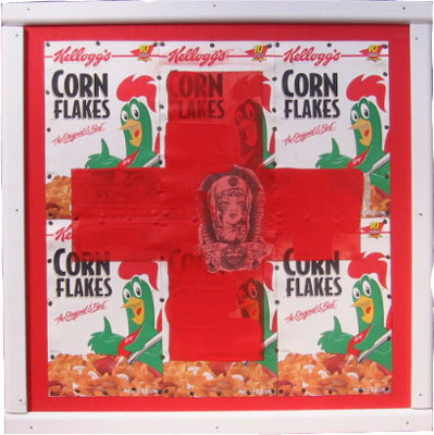 Acrylic and mixed media on cereal boxes and wood